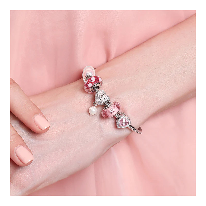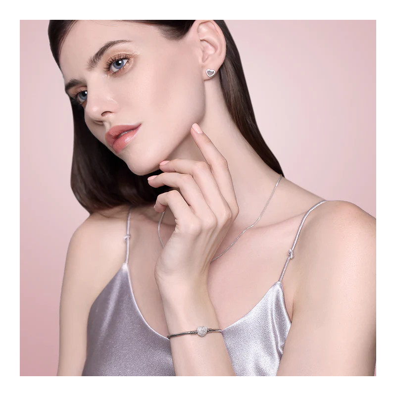 Pulsera de Plata de Ley 925 | Plata esterlina con circonitas en el broche con forma de corazón de color rosa en el frontal, también de plata de ley. Se puede combinar con Chram/Abalorios o sola. En caso de introducir charms a la pulsera, es compatible con abalorios de otras marcas mas reconocidas y comerciales.